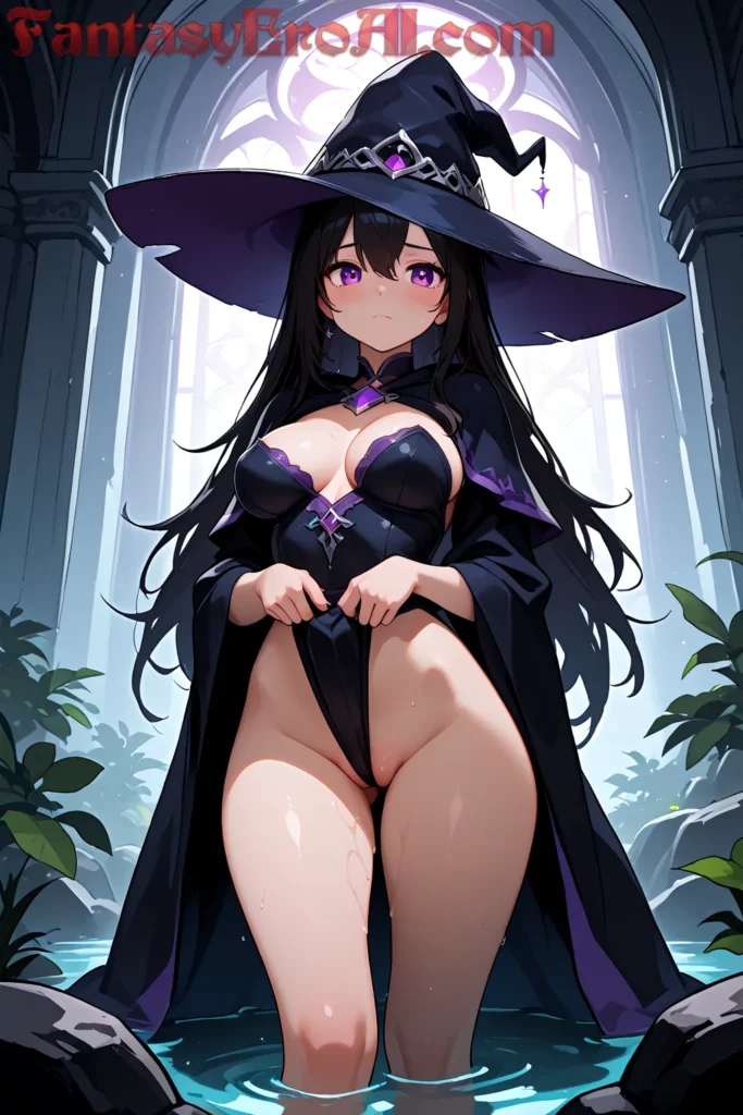 Vive guerrera bruja en castillo de sombras encantadas, arte erótico fantasía AI soft con hechizos combativos y misterio que atrae castillos oscuros fantásticos.