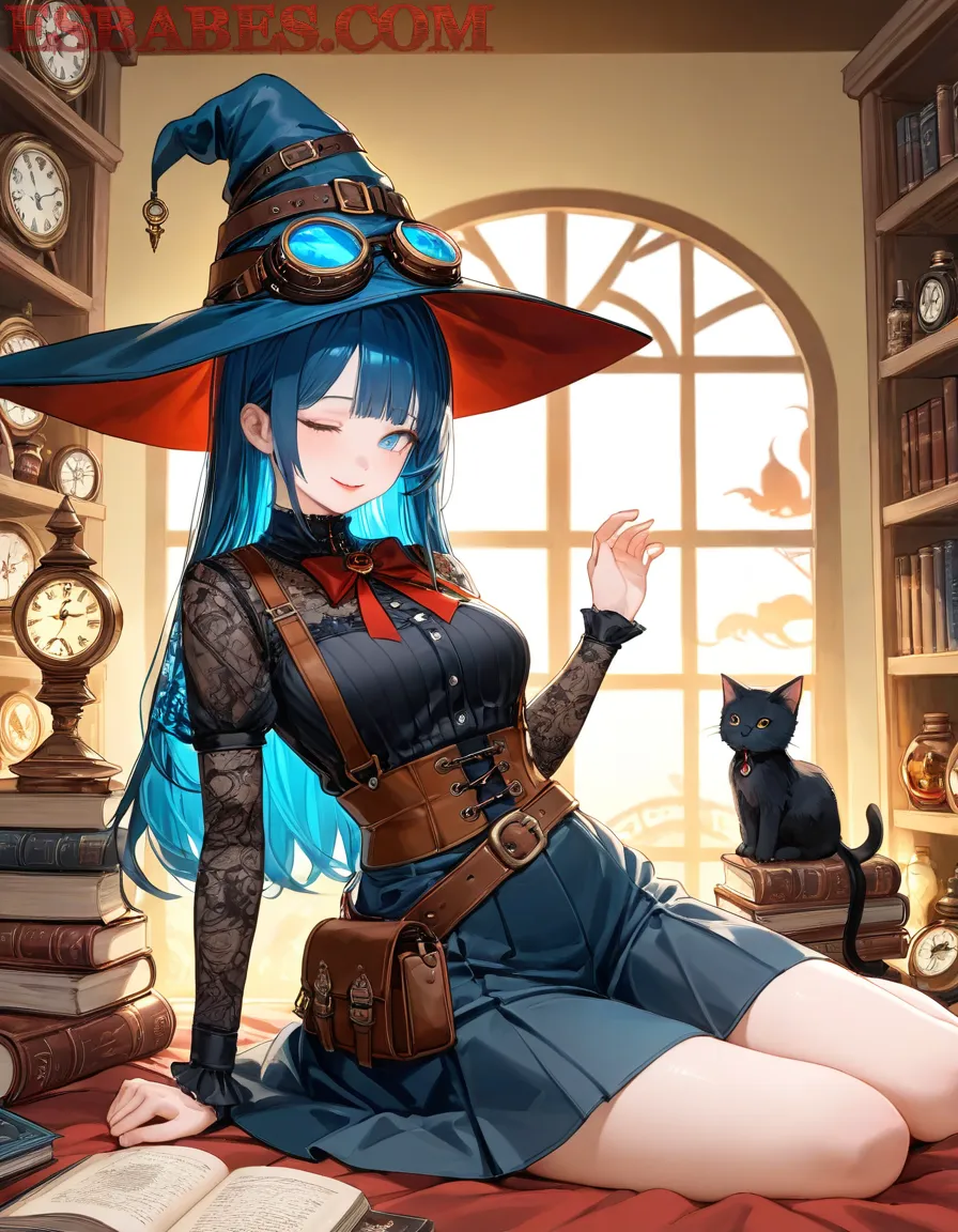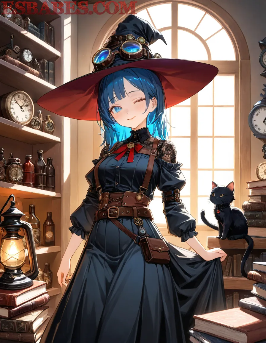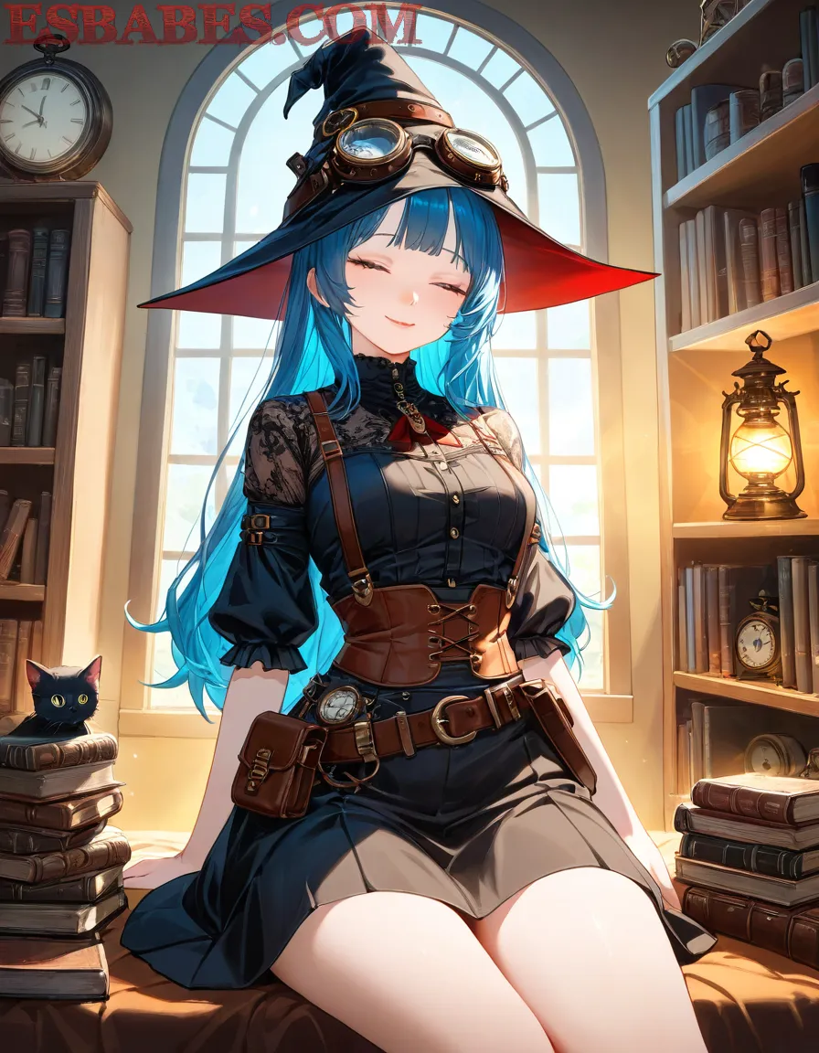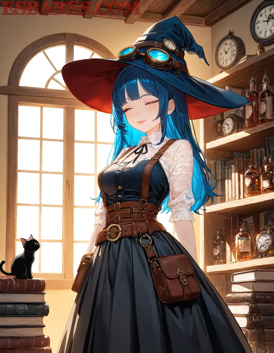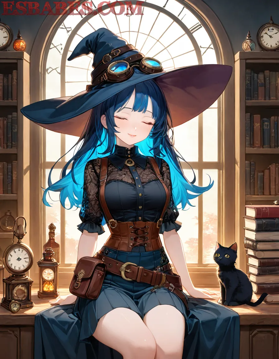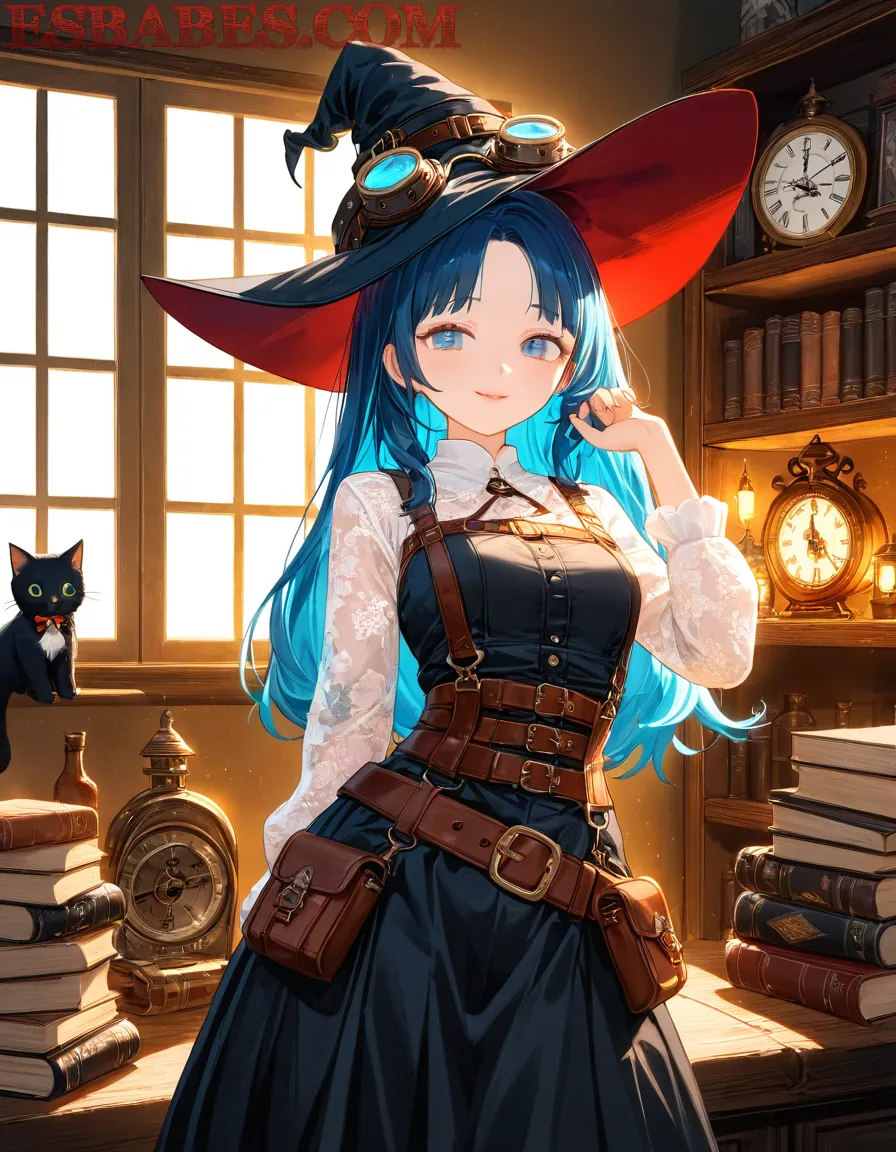 A beautiful anime witch with long blue hair wearing a steampunk-style black dress and leather corset, big hat with blue glowing goggles, standing in a magical vintage library with old books, clocks and oil lamps, warm sunlight coming through the window, soft lighting, fantasy atmosphere, ultra detailed, 4K, highly detailed face and textures, art by Makoto Shinkai and Studio Ghibli style,
